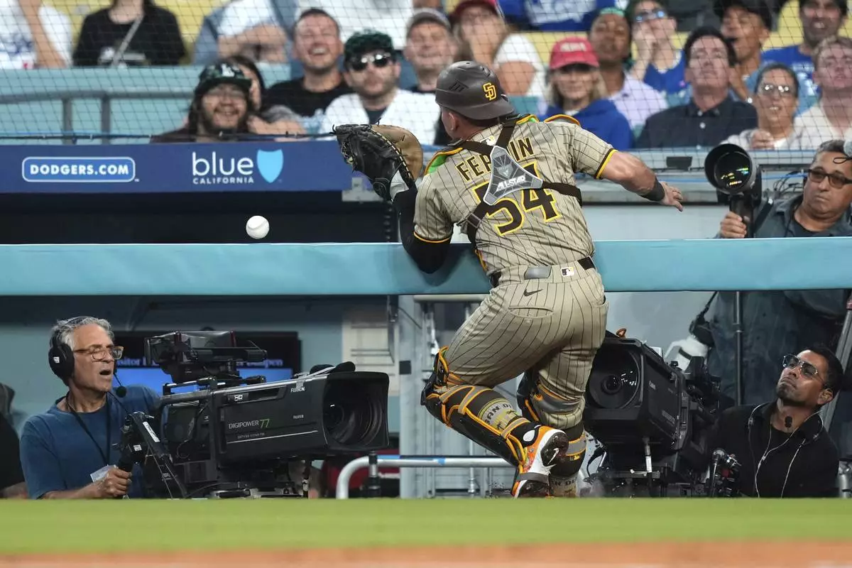 San Diego Padres catcher Freddy Fermin is unable the catch a foul ball hit by Los Angeles Dodgers' Andy Pages during the second inning of a baseball game Friday, Aug. 15, 2025, in Los Angeles. (AP Photo/Mark J. Terrill)