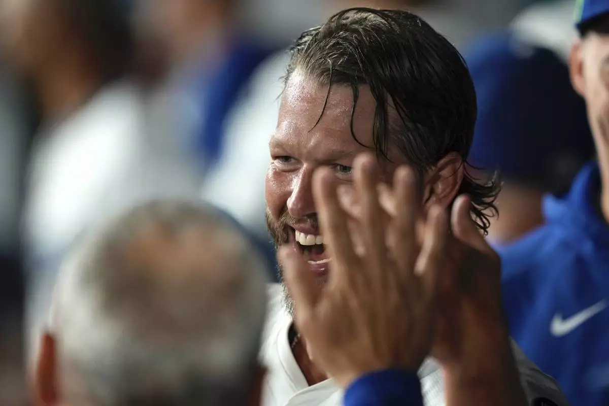 Los Angeles Dodgers starting pitcher Clayton Kershaw is congratulated by teammates in the dugout after finishing the sixth inning of a baseball game against the San Diego Padres, Friday, Aug. 15, 2025, in Los Angeles. (AP Photo/Mark J. Terrill)