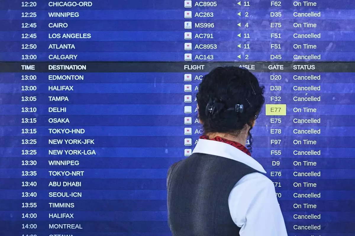 Cancelled and delayed Air Canada flights are seen on the departure board at Montreal-Pierre Elliott Trudeau International Airport in Dorval, Que., Friday, Aug. 15, 2025. (Christinne Muschi/The Canadian Press via AP)