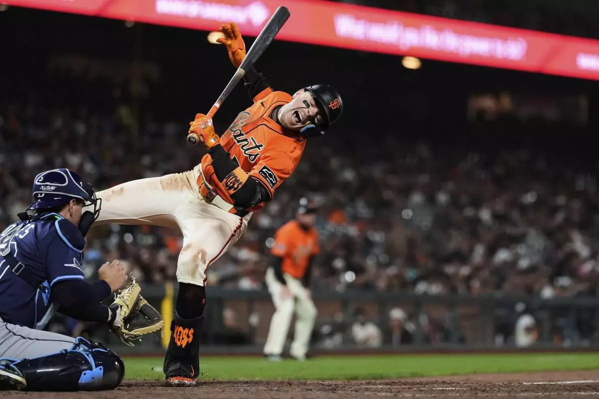San Francisco Giants' Christian Koss, right, reacts next to Tampa Bay Rays catcher Nick Fortes after being hit by a pitch during the eighth inning of a baseball game Friday, Aug. 15, 2025, in San Francisco. (AP Photo/Godofredo A. Vásquez)
