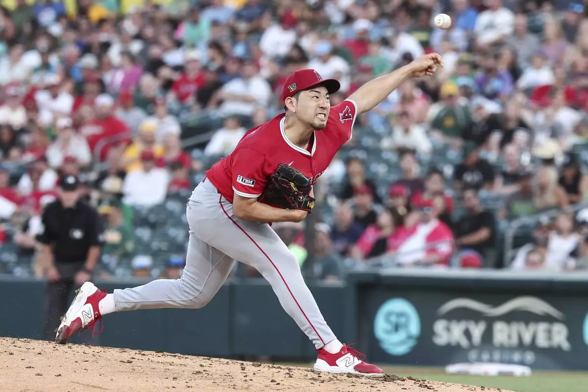 Los Angeles Angels pitcher Yusei Kikuchi throws to the Athletics during the second inning of a baseball game Friday, Aug. 15, 2025, in West Sacramento, Calif. (AP Photo/Sara Nevis)