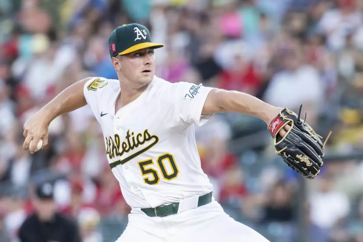 Athletics pitcher Jack Perkins throws to the Los Angeles Angels during the second inning of a baseball game Friday, Aug. 15, 2025, in West Sacramento, Calif. (AP Photo/Sara Nevis)