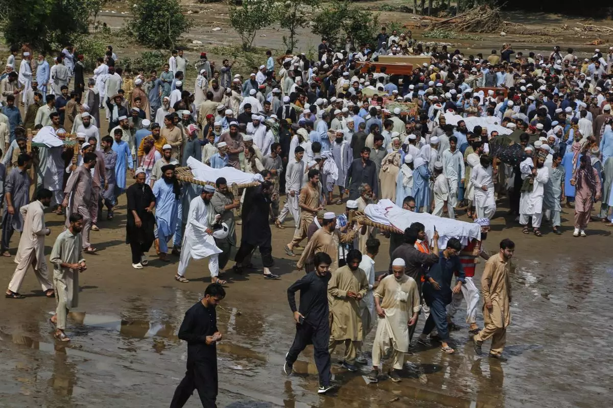 People carry bodies of victims of Friday's flash flooding, after funeral prayers at a village near Pir Baba, Buner district, in Pakistan's northwest, Saturday, Aug.16, 2025. (AP Photo/Muhammad Sajjad)