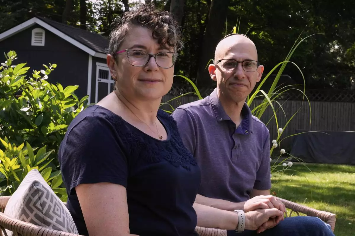 Ziva Mann and her husband Ezra, right, parents of a transgender child and members of a welcoming synagogue, pose in the backyard of their home, Wednesday, Aug. 13, 2025, in Newton, Mass. (AP Photo/Charles Krupa)