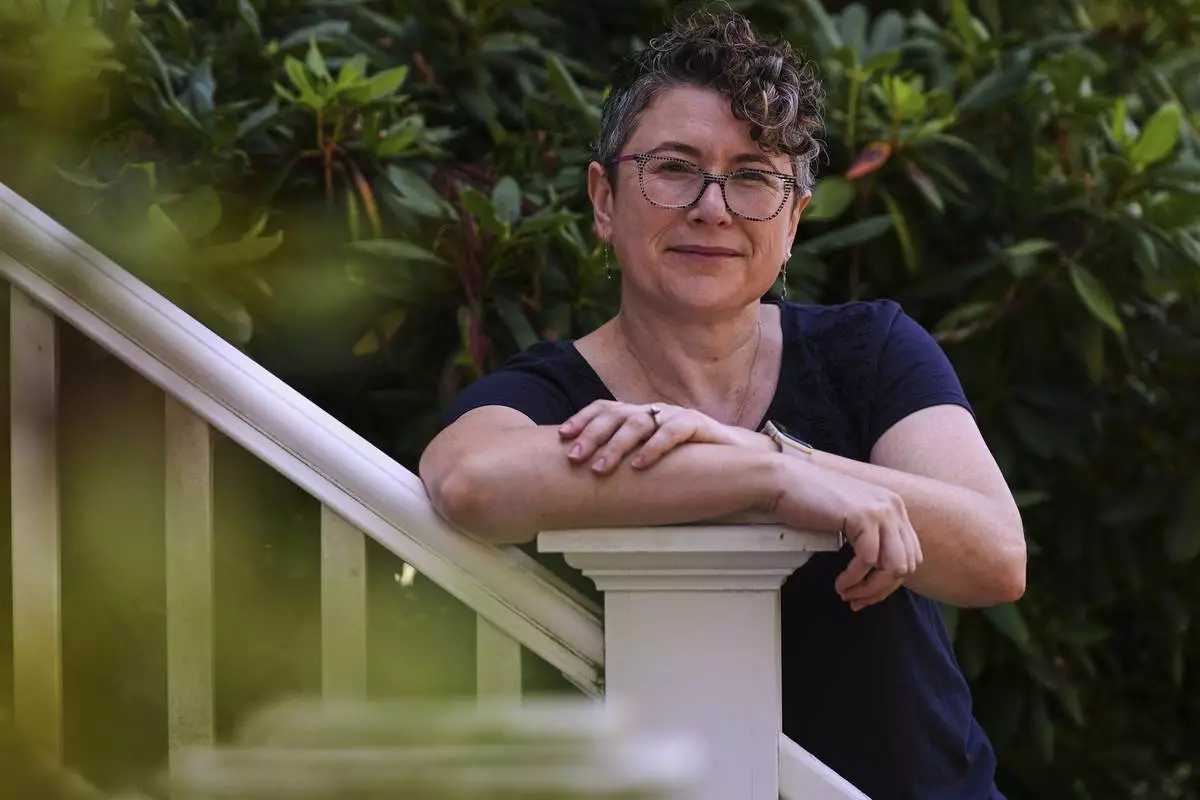 Ziva Mann, mother of a transgender child and member of a welcoming synagogue, poses outside her home, Wednesday, Aug. 13, 2025, in Newton, Mass. (AP Photo/Charles Krupa)