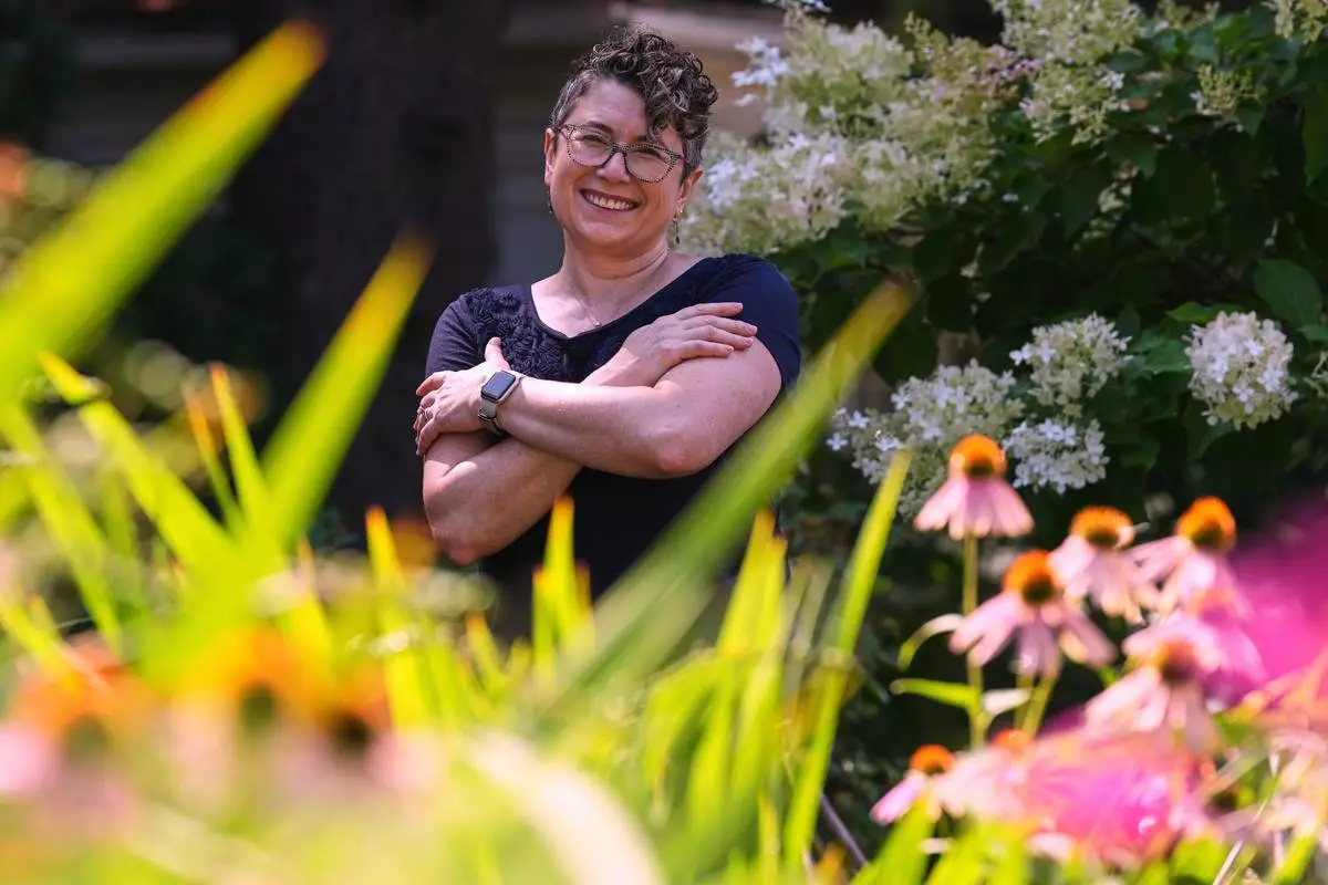 Ziva Mann, mother of a transgender child and member of a welcoming synagogue, poses in her garden, Wednesday, Aug. 13, 2025, in Newton, Mass. (AP Photo/Charles Krupa)