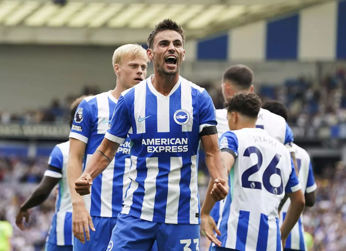 Brighton and Hove Albion's Matt O'Riley, front, celebrates scoring the opening goal during the English Premier League soccer match between Brighton and Hove Albion and FC Fulham in Brighton, England, Saturday, Aug. 16, 2025. (Gareth Fuller/PA via AP)