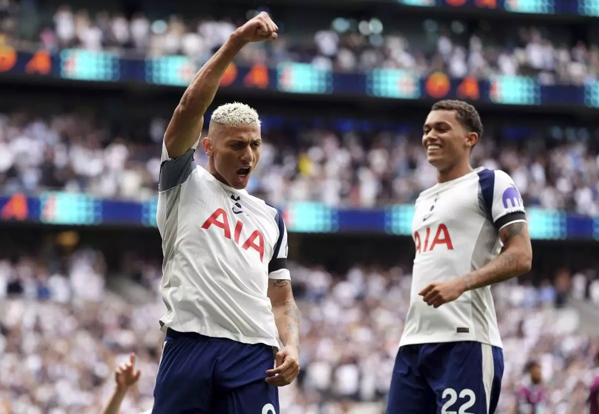 Tottenham Hotspur's Richarlison, left, celebrates scoring the opening goal during the the English Premier League soccer match between Tottenham Hotspur and Burnley at the Tottenham Hotspur Stadium in London, Saturday, Aug. 16, 2025. (Adam Davy/PA via AP)