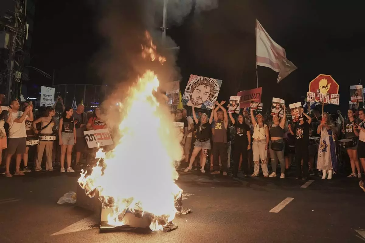 People take part in a protest demanding the end of the war, the immediate release of hostages held by Hamas in the Gaza Strip, and against Prime Minister Benjamin Netanyahu's government in Tel Aviv, Saturday, Aug. 16, 2025. (AP Photo/Mahmoud Illean)