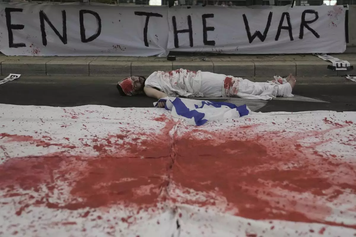 A demonstrator lies on the ground painted in red, symbolizing blood, during a protest demanding the end of the war, the immediate release of hostages held by Hamas in the Gaza Strip, and against Prime Minister Benjamin Netanyahu's government in Tel Aviv, Israel, Saturday, Aug. 16, 2025. (AP Photo/Mahmoud Illean)