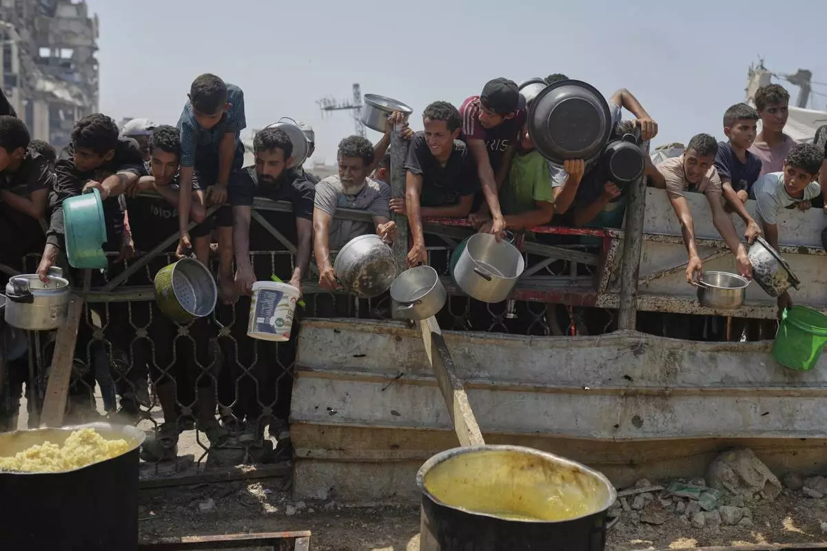 Palestinians struggle to get donated food at a community kitchen in Gaza City, northern Gaza Strip, Saturday, Aug. 16, 2025. (AP Photo/Jehad Alshrafi)