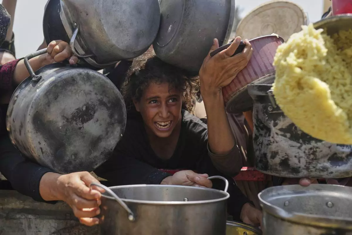 A Palestinian girl struggles to get donated food at a community kitchen in Gaza City, northern Gaza Strip, Saturday, Aug. 16, 2025. (AP Photo/Jehad Alshrafi)