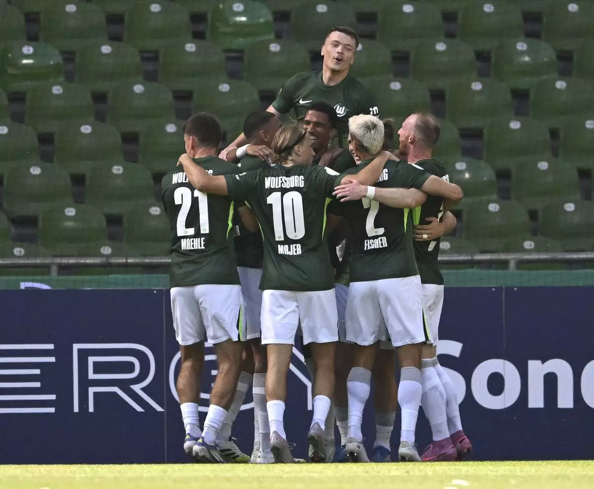 Wolfsburg's players celebrate the opening goal during the German soccer cup first round match between SV Hemelingen and VfL Wolfsburg in Bremen, Germany, Saturday, Aug 16, 2025. (Carmen Jaspersen/dpa via AP)