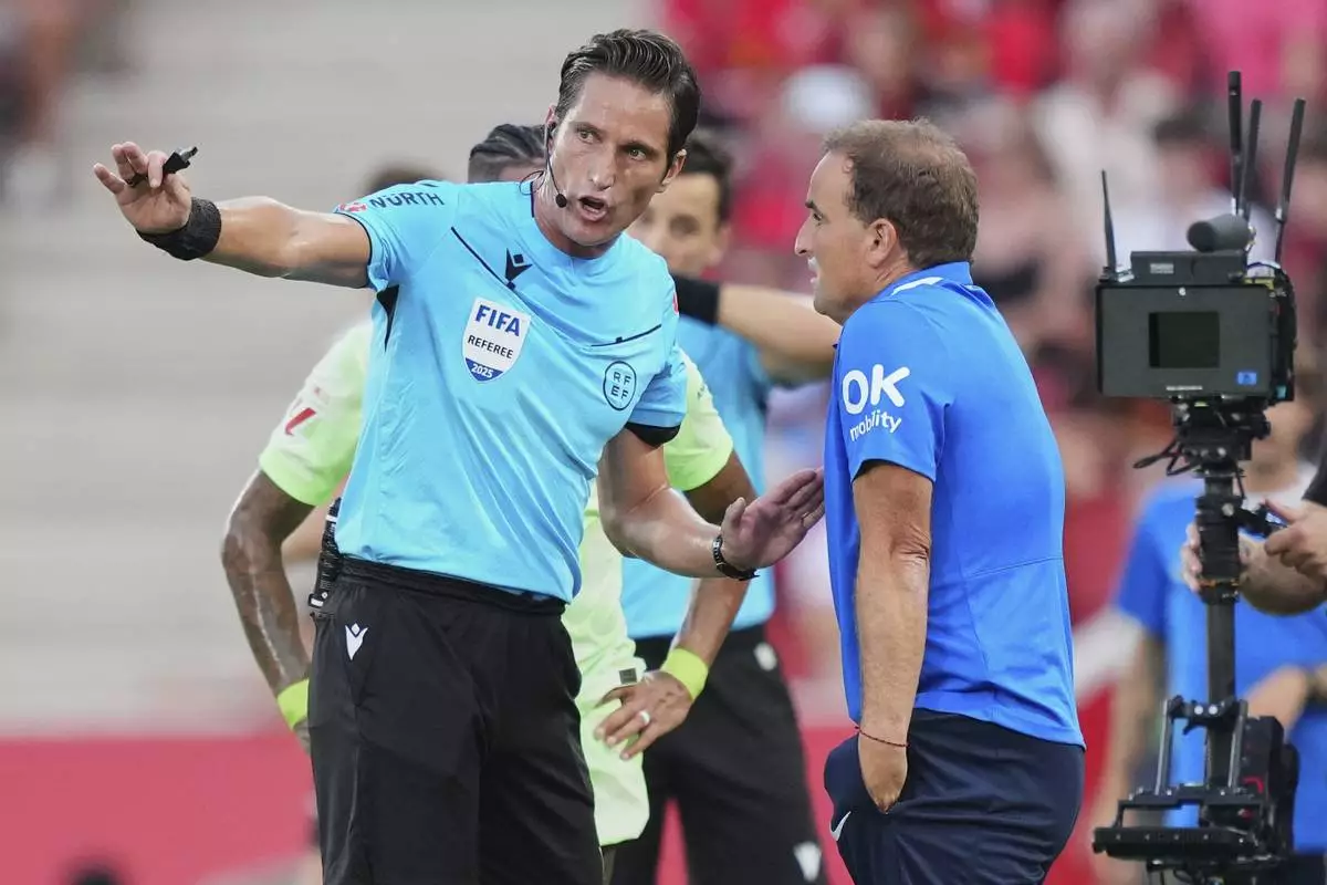 Mallorca's head coach Jagoba Arrasate argues with the referee during the La Liga soccer match between Mallorca and Barcelona in Mallorca, Spain, Saturday, Aug. 16, 2025. (AP Photo/Joan Mateu Parra)