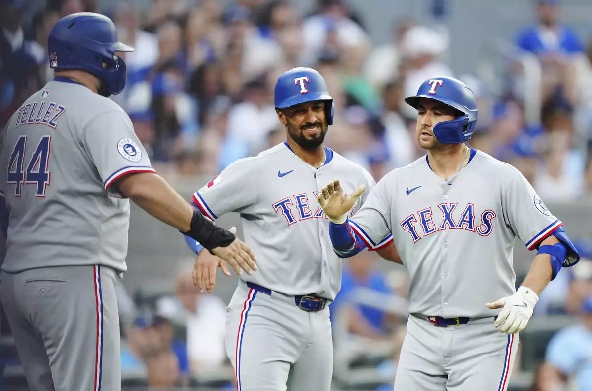 Texas Rangers catcher Kyle Higashioka, right, celebrates his three-run home run against the Toronto Blue Jays with Rangers' Rowdy Tellez (44) and Marcus Semien during the second inning of a baseball game in Toronto on Friday, Aug. 15, 2025. (Frank Gunn/The Canadian Press via AP)