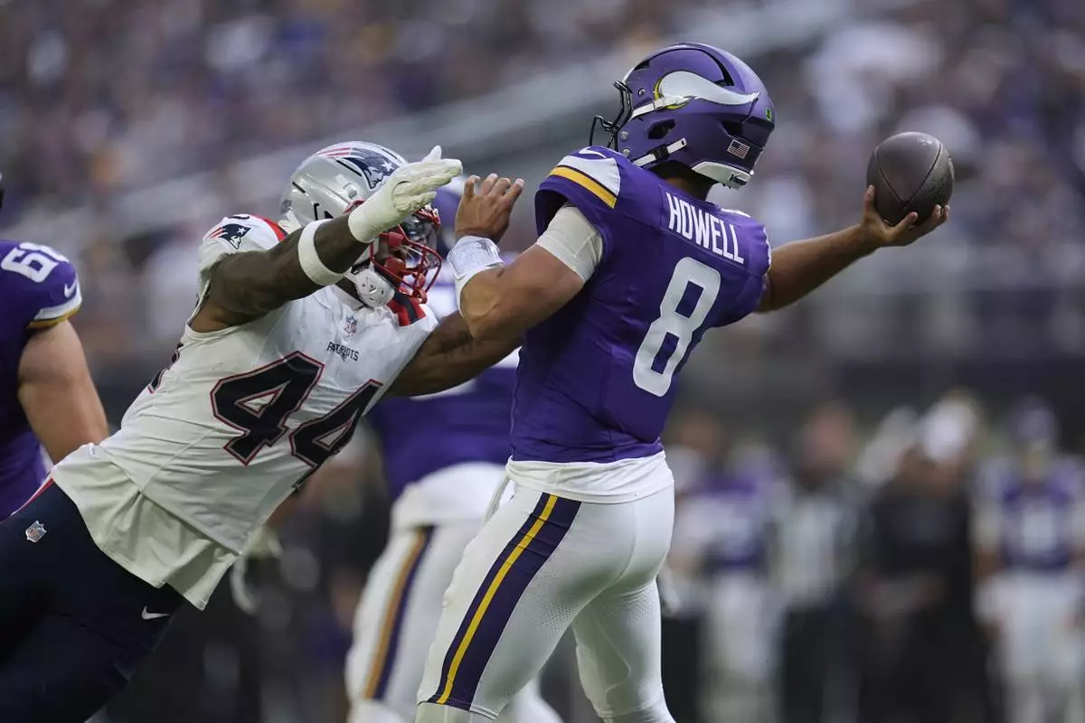 Minnesota Vikings quarterback Sam Howell (8) passes under pressure from New England Patriots linebacker K'Lavon Chaisson (44) during the first half of a preseason NFL football game Saturday, Aug. 16, 2025, in Minneapolis. (AP Photo/Abbie Parr)