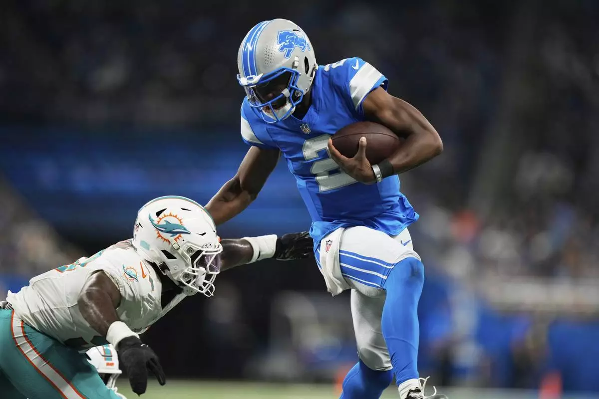 Detroit Lions quarterback Hendon Hooker (2) carries against Miami Dolphins linebacker Dequan Jackson during the second half of an NFL preseason football game Saturday, Aug. 16, 2025, in Detroit. (AP Photo/Ryan Sun)