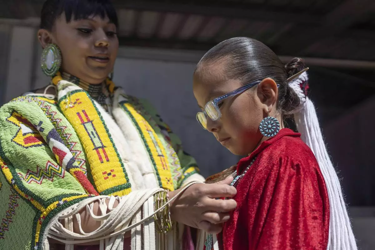 FILE - Shantal Sandoval, left, and her eight year-old daughter Chanel Yazzie, of To'hajiilee, N.M., prepare to participate in a horse parade at the 40th anniversary of the Gathering of Nations Pow Wow in Albuquerque, N.M., April 28, 2023. (AP Photo/Roberto E. Rosales, File)
