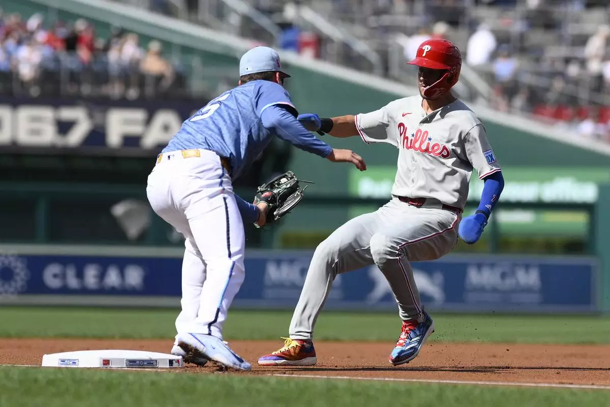 Philadelphia Phillies' Trea Turner, right, is caught attempting to steal third base by Washington Nationals third baseman Brady House, left, during the first inning of a baseball game, Saturday, Aug. 16, 2025, in Washington. (AP Photo/Nick Wass)