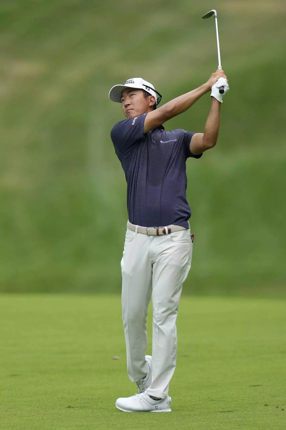 Michael Kim hits on the fourth hole during the third round of the BMW Championship golf tournament Saturday, Aug. 16, 2025, in Owings Mills, Md. (AP Photo/Stephanie Scarbrough)