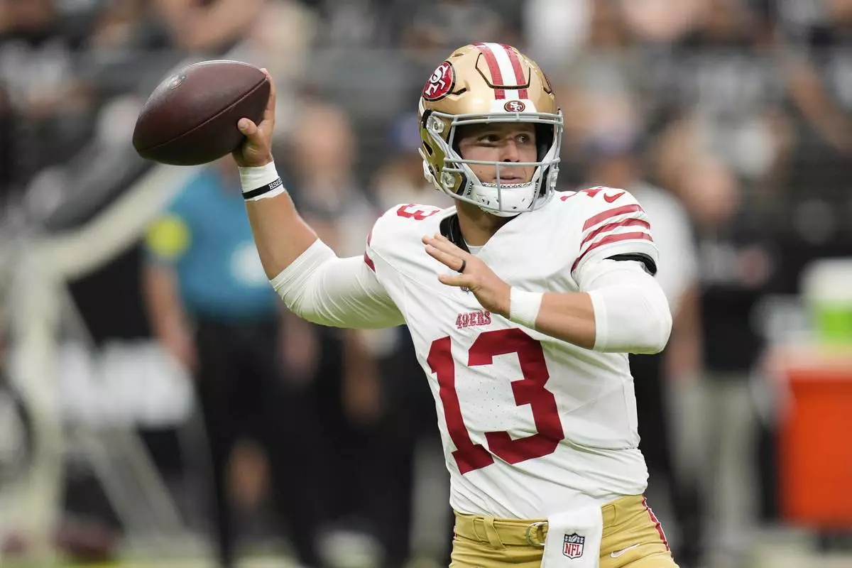 San Francisco 49ers quarterback Brock Purdy (13) throws as pass during the first half of a preseason NFL football game against the Las Vegas Raiders, Saturday, Aug. 16, 2025, in Las Vegas. (AP Photo/John Locher)