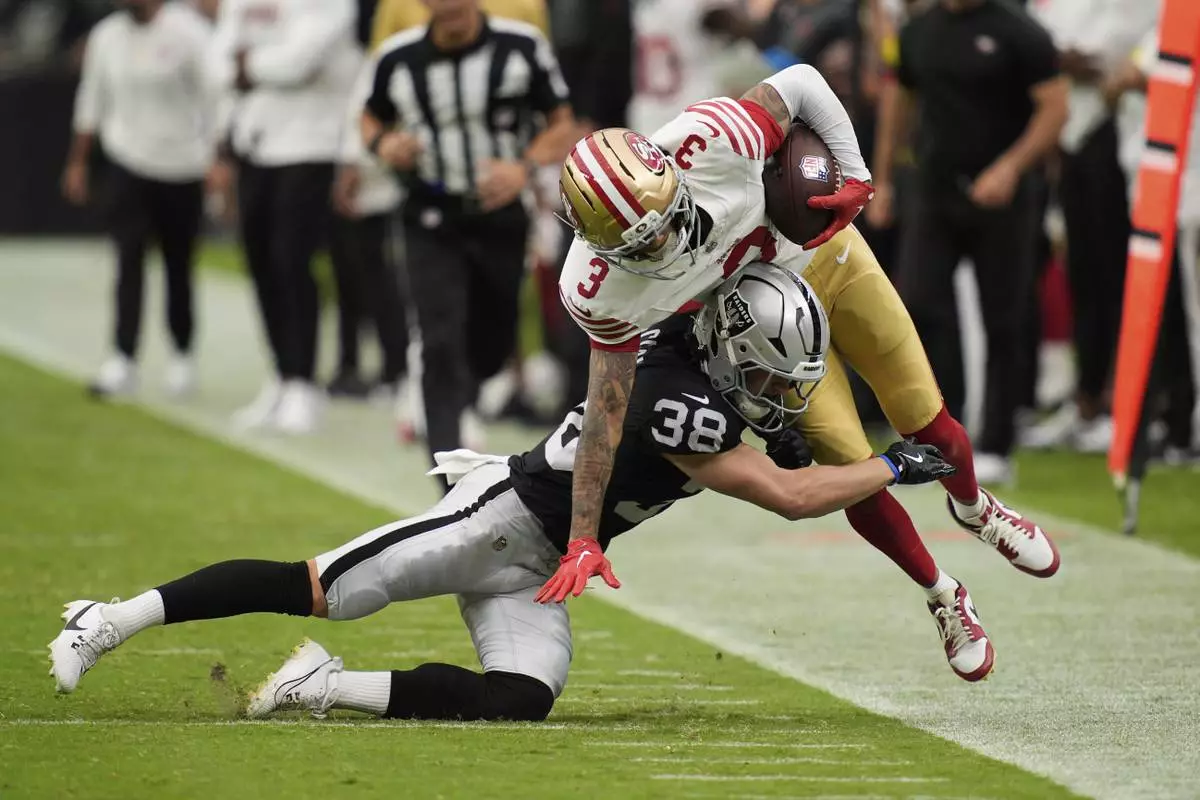 San Francisco 49ers wide receiver Robbie Chosen (3) is tackled by Las Vegas Raiders safety Hudson Clark (38) during the second half of a preseason NFL football game Saturday, Aug. 16, 2025, in Las Vegas. (AP Photo/John Locher)