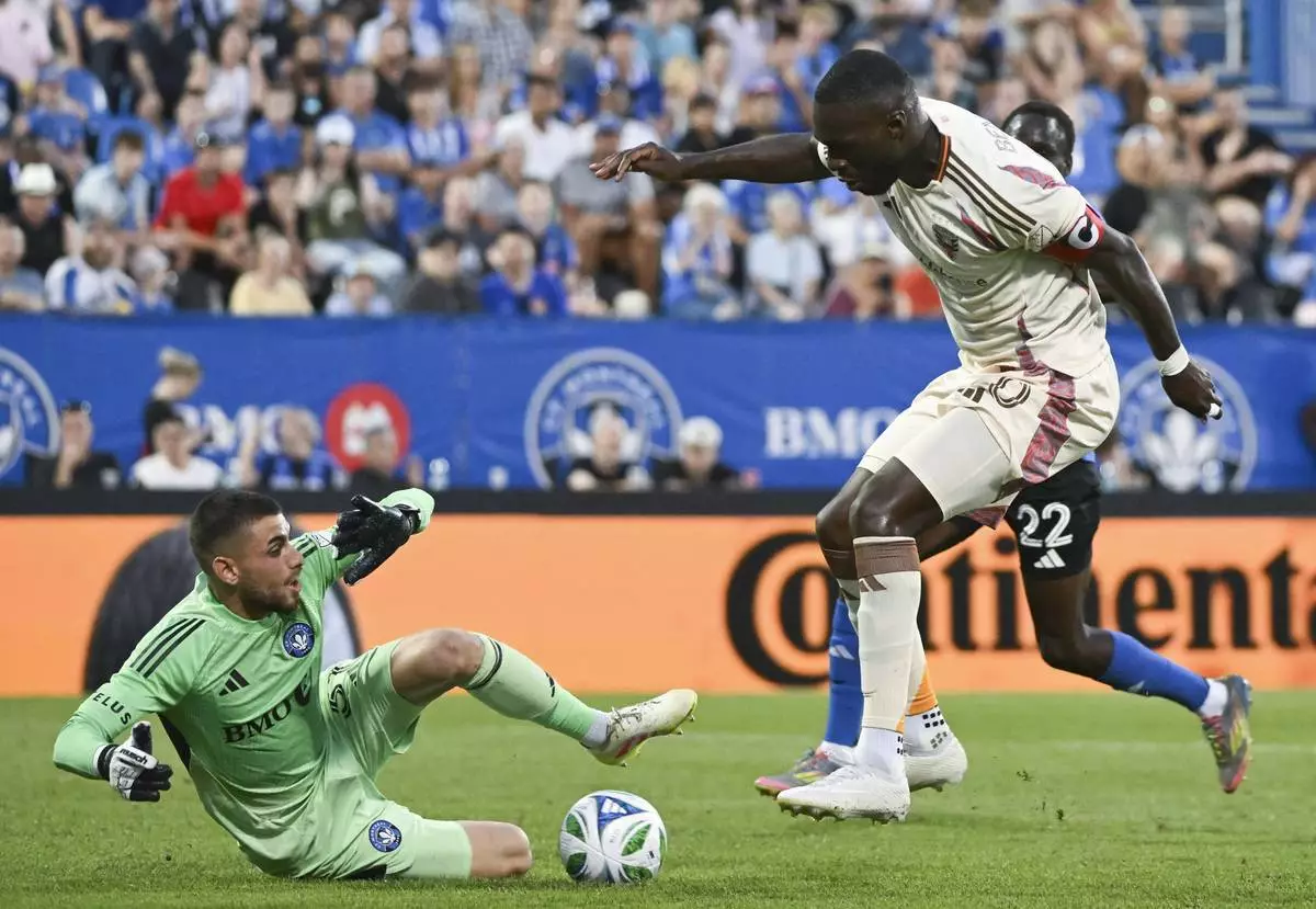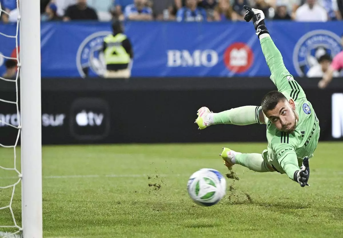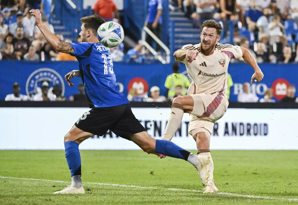 CF Montreal goalkeeper Thomas Gillier is scored against by D.C. United's Jackson Hopkins during first-half MLS soccer match action in Montreal, Saturday, Aug. 16, 2025. (Graham Hughes/The Canadian Press via AP)