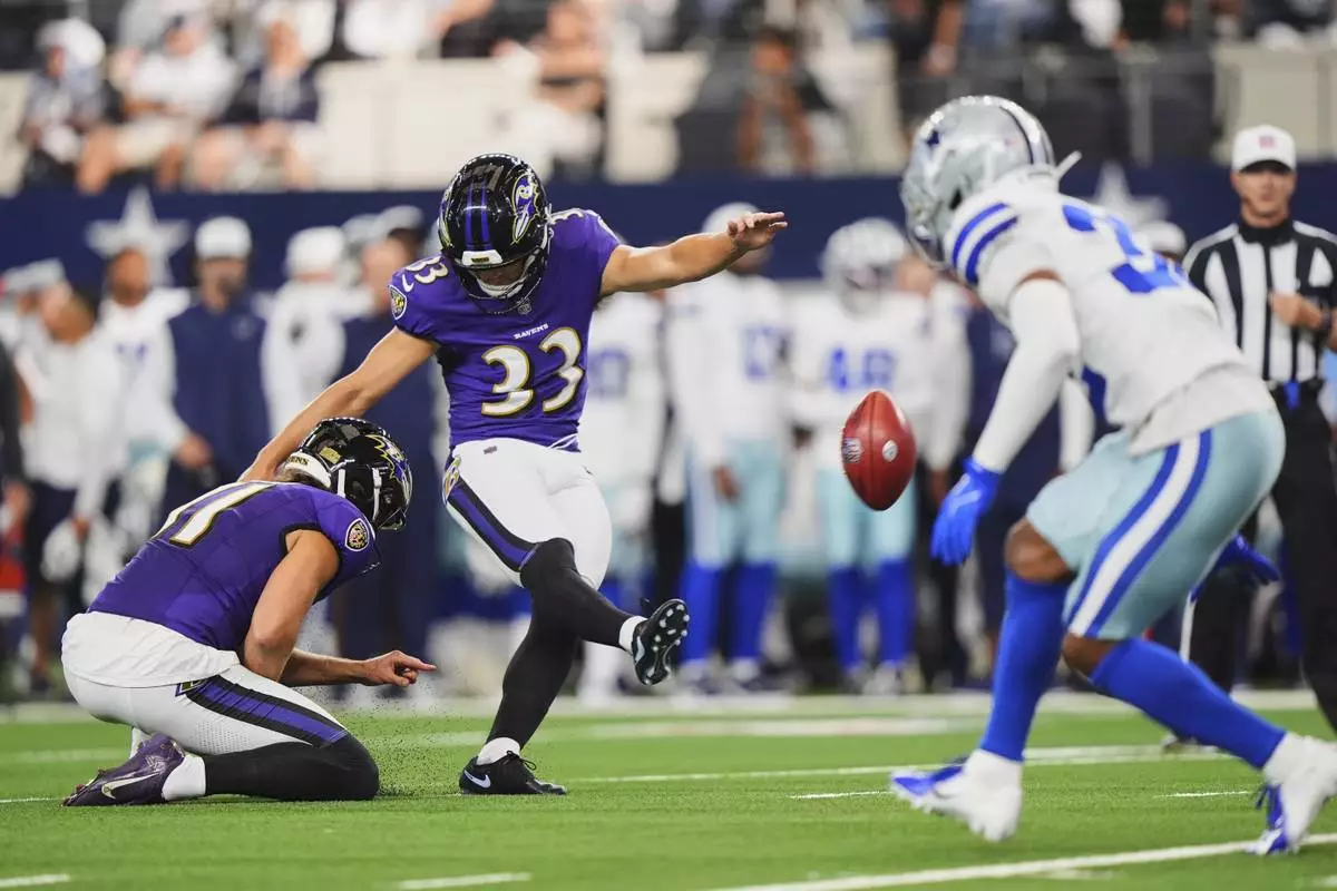 Baltimore Ravens place kicker Tyler Loop (33) kicks a field goal in the first half of a preseason NFL football game against the Dallas Cowboys Saturday, Aug. 16, 2025, in Arlington, Texas. (AP Photo/LM Otero)
