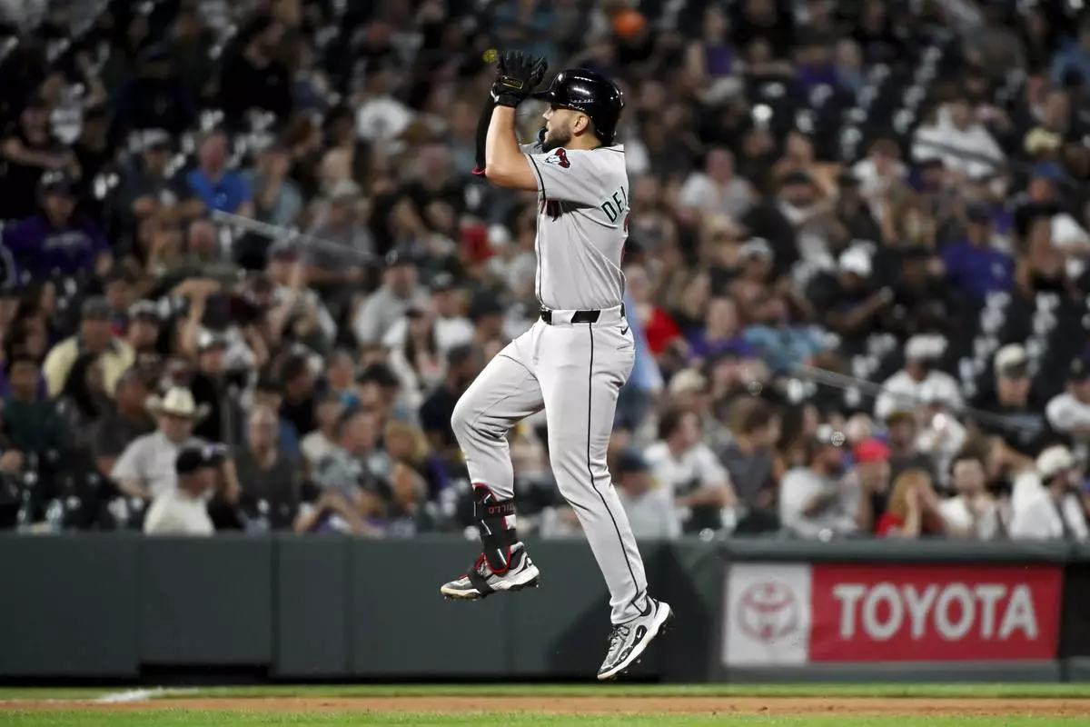 Arizona Diamondbacks' Adrian Del Castillo celebrates after hitting a two-run home run in the seventh inning of a baseball game against the Colorado Rockies, Saturday, Aug. 16, 2025, in Denver. (AP Photo/Geneva Heffernan)