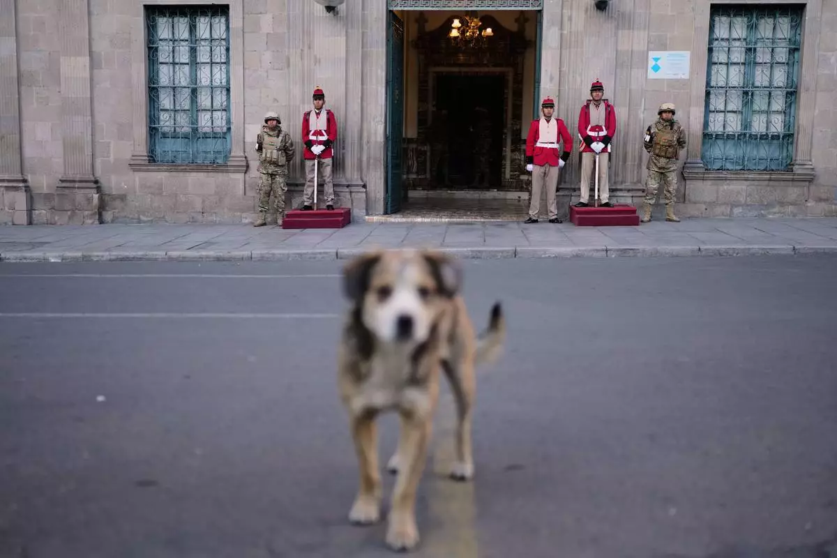 Honor guards stand outside the presidential palace, days ahead of the presidential election in La Paz, Bolivia, Wednesday, Aug. 13, 2025. (AP Photo/Natacha Pisarenko)