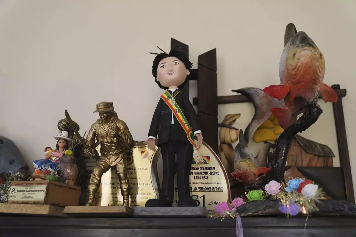 A doll adorned with a miniature presidential depicting former President Evo Morales, who is promoting a null vote campaign in the presidential and legislative elections, sits on a shelf in his office during an interview in Lauca N, Chapare region, Bolivia, Saturday, Aug. 16, 2025. (AP Photo/Jorge Saenz)