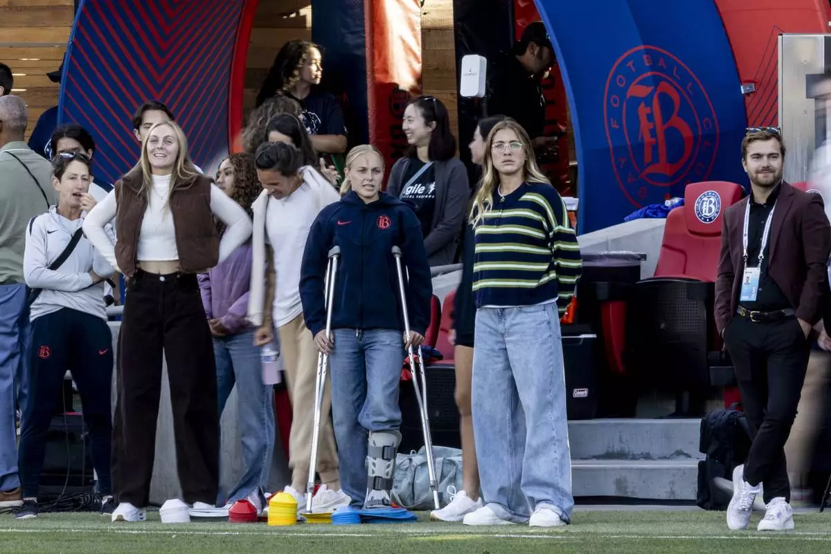 Bay FC forward Penelope Hocking, center on crutches, stands on the sideline before a NWSL soccer match against San Diego Wave FC in San Jose, Calif., Saturday, Aug. 16, 2025. (Stephen Lam/San Francisco Chronicle via AP)