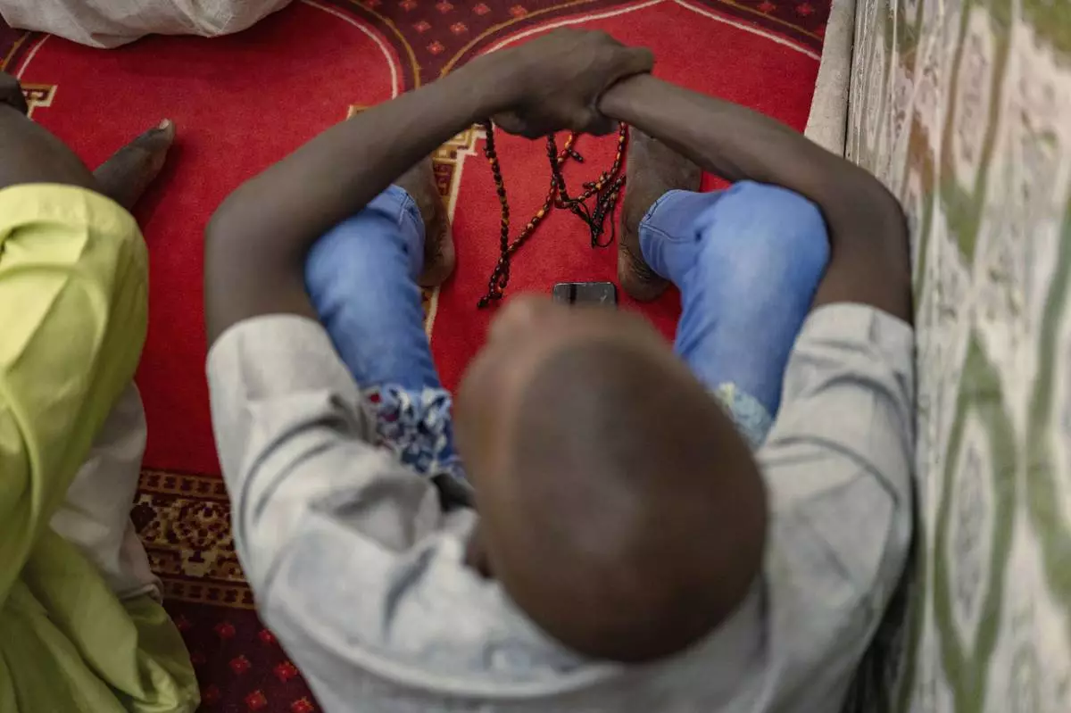 A woman prays in the designated women's section at the Great Mosque of Nietty Mbar in Thiaroye, a suburb of Dakar, Senegal, Friday, July 4, 2025.(AP Photo/Sylvain Cherkaoui)