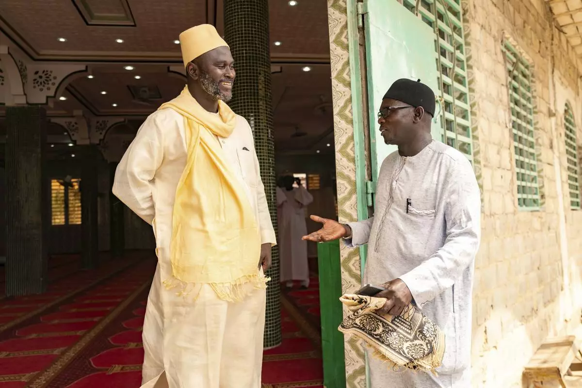 Imam Ibrahima Diane, left, advocate for an end to gender-based violence and practices like female genital mutilation, discusses with El Hadj Malick, coordinator of the "École des Maris" program at the Great Mosque of Nietty Mbar in Thiaroye, a suburb of Dakar, Senegal, Friday, July 4, 2025.(AP Photo/Sylvain Cherkaoui)
