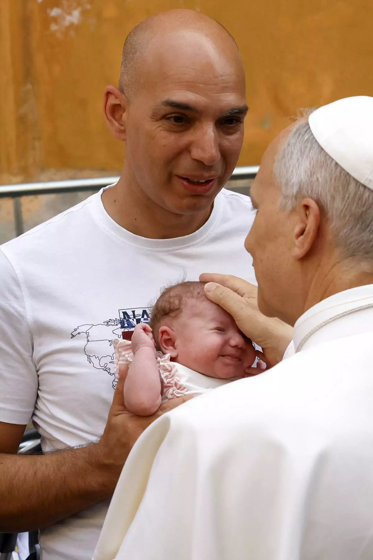 Pope Leo XIV caresses a baby as he arrives to celebrate a Mass at the Sanctuary of Santa Maria della Rotonda in Albano Laziale, near Rome, Sunday, Aug. 17, 2025. (AP Photo/Riccardo De Luca)