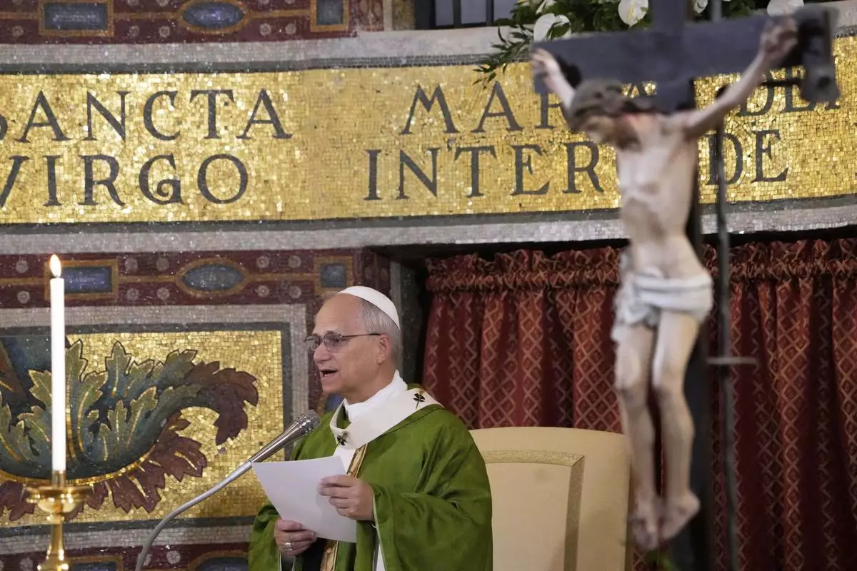 Pope Leo XIV celebrates a Mass at the Santa Maria della Rotonda Sanctuary in Albano Laziale, Sunday, Aug. 17, 2025. (AP Photo/Gregorio Borgia, Pool)