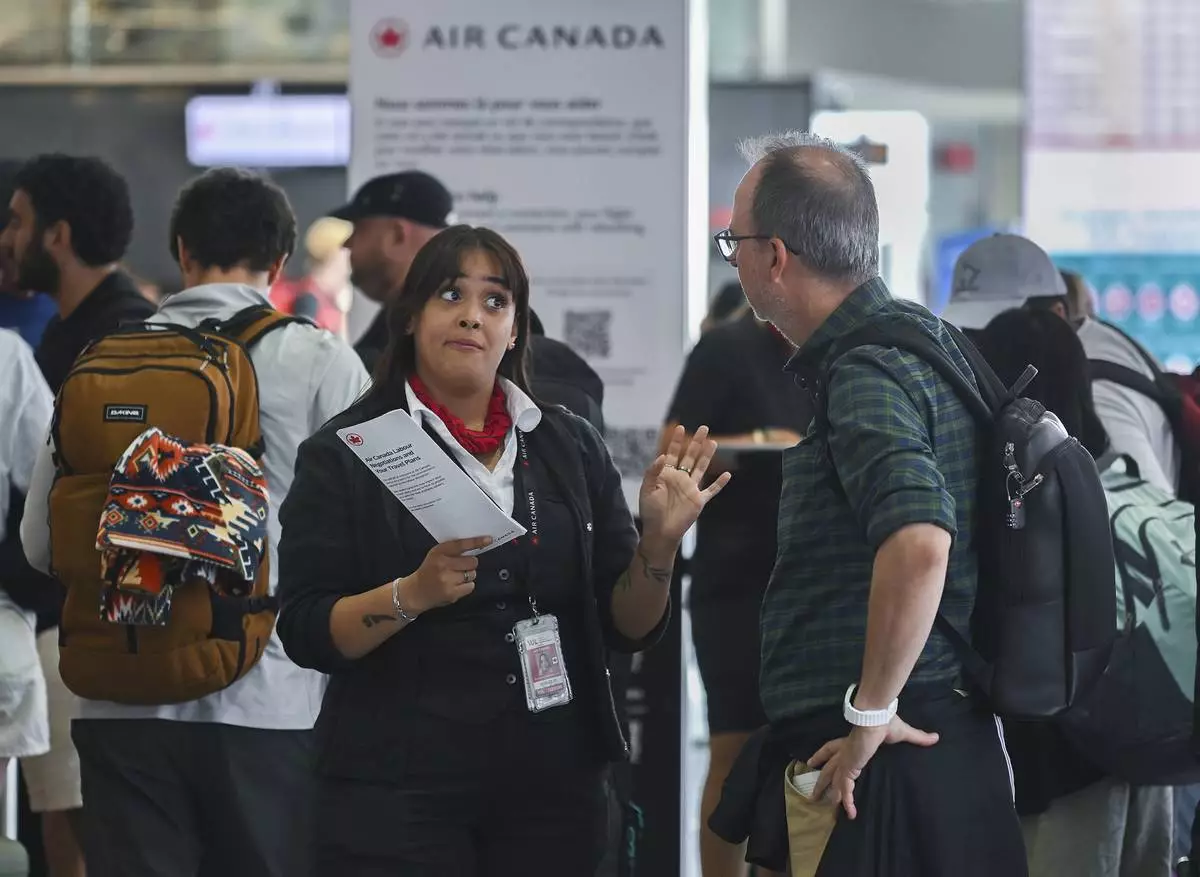 An Air Canada agent, left, talks with a man as Air Canada flight attendants strike at Montreal-Pierre Elliott Trudeau International Airport in Montreal, Saturday, Aug. 16, 2025. (Graham Hughes/The Canadian Press via AP)