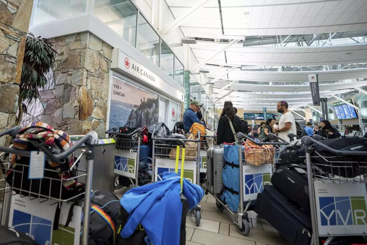 A man tries to check in to his Air Canada flight at the Vancouver International Airport in Richmond, B.C., Canada, on Saturday, Aug. 16, 2025. (Ethan Cairns/The Canadian Press via AP)