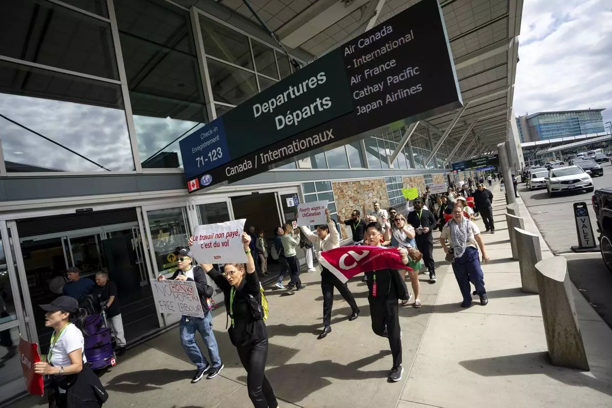 Picketers march around the departures level at the Vancouver International Airport in Richmond, British Columbia, Sunday, Aug. 17, 2025. (Ethan Cairns/The Canadian Press via AP)