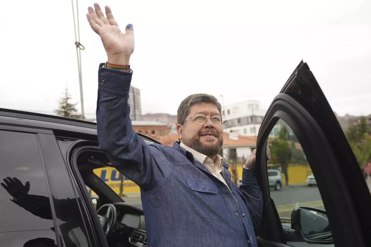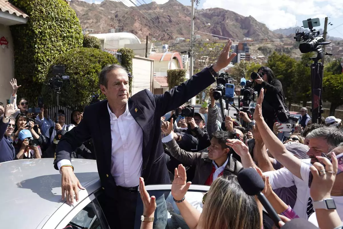 Presidential candidate Jorge "Tuto" Quiroga waves after voting in general elections in La Paz, Bolivia, Sunday, Aug. 17, 2025. (AP Photo/Freddy Barragan)