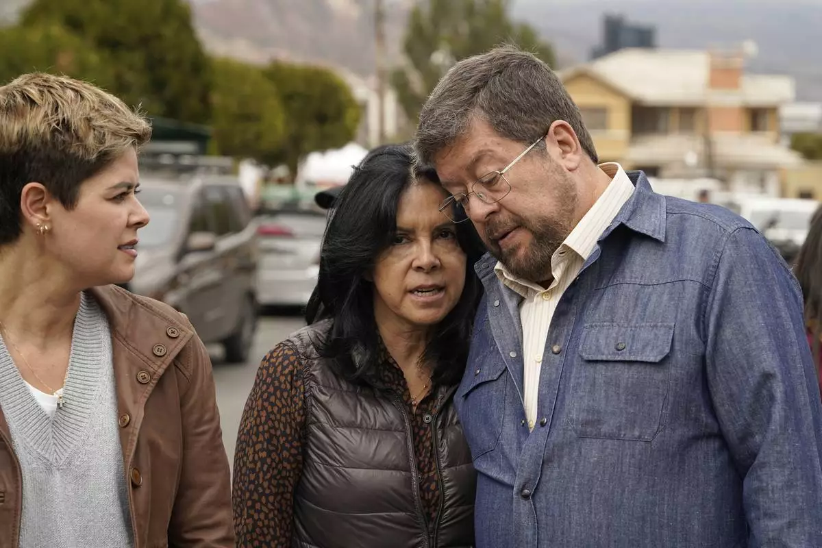 Presidential candidate Samuel Doria Medina embraces his wife, Nidia Monje, as their daughter Sandra looks on after he voted in general elections in La Paz, Bolivia, Sunday, Aug. 17, 2025. (AP Photo/Freddy Barragan)