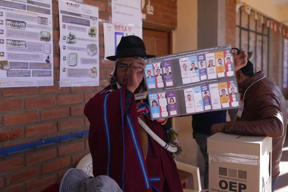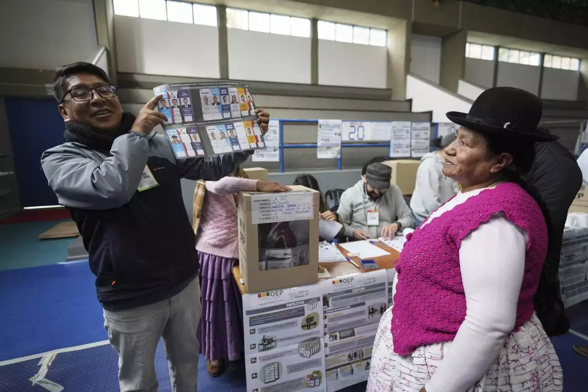 An electoral official shows to voters the presidential ballot during general elections in Jesus de Machaca, Bolivia, Sunday, Aug. 17, 2025. (AP Photo/Juan Karita)