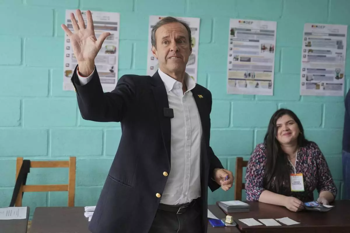 Presidential candidate Jorge "Tuto" Quiroga waves before voting in general elections in La Paz, Bolivia, Sunday, Aug. 17, 2025. (AP Photo/Natacha Pisarenko)