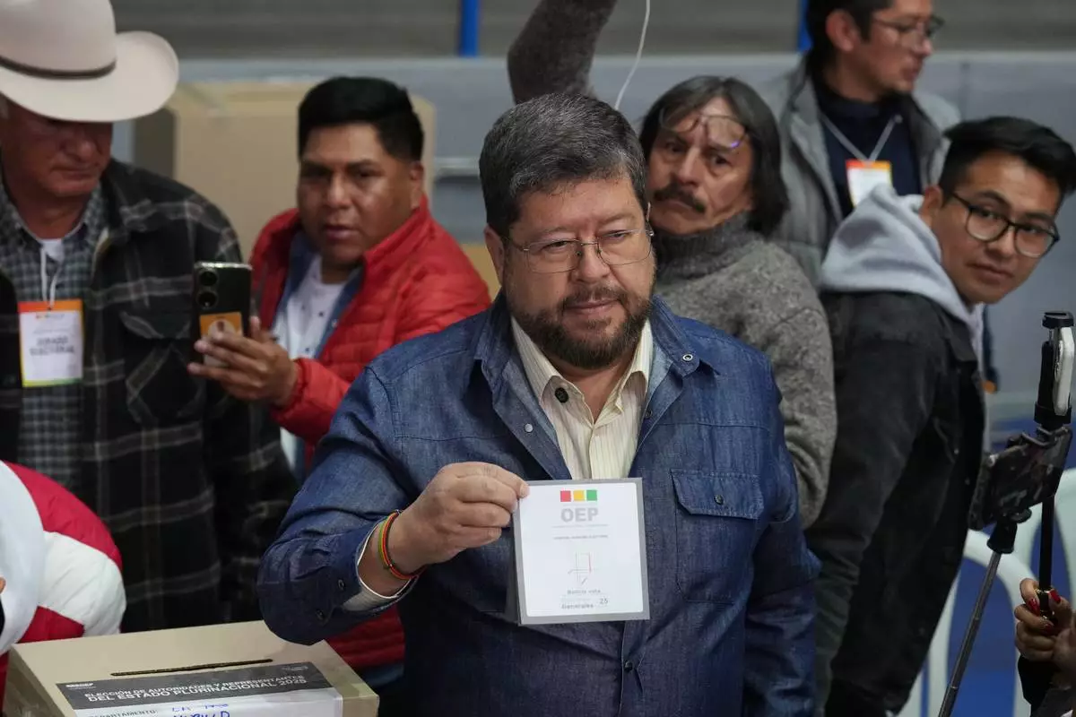 Presidential candidate Samuel Doria Medina shows his ballot during national elections in La Paz, Bolivia, Sunday, Aug. 17, 2025. (AP Photo/Natacha Pisarenko)