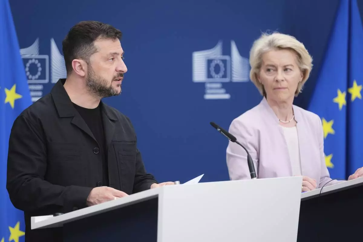 European Commission President Ursula von der Leyen, right, and Ukraine's President Volodymyr Zelenskyy participate in a media conference at EU headquarters in Brussels, Belgium, Sunday, Aug. 17, 2025. (AP Photo)
