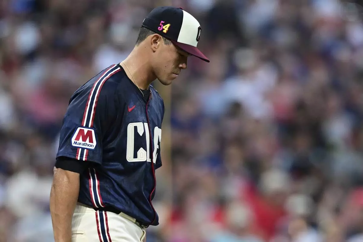 Cleveland Guardians starting pitcher Joey Cantillo reacts after a bases loaded walk during the fourth inning of a baseball game against the Atlanta Braves, Friday, Aug. 15, 2025, in Cleveland. (AP Photo/David Dermer)