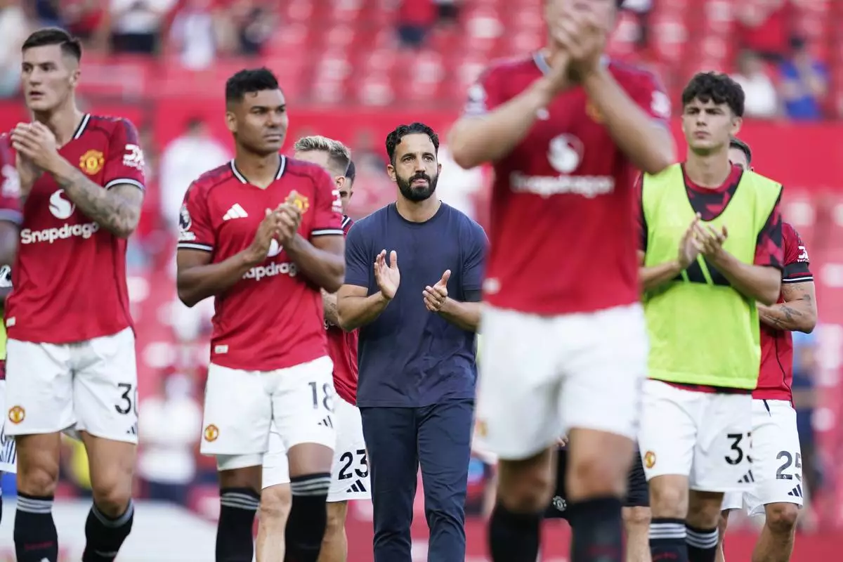 Manchester United's head coach Ruben Amorim and his players greet fans after the English Premier League soccer match between Manchester United and Arsenal at Old Trafford stadium in Manchester, England, Sunday, Aug. 17, 2025. (AP Photo/Dave Thompson)