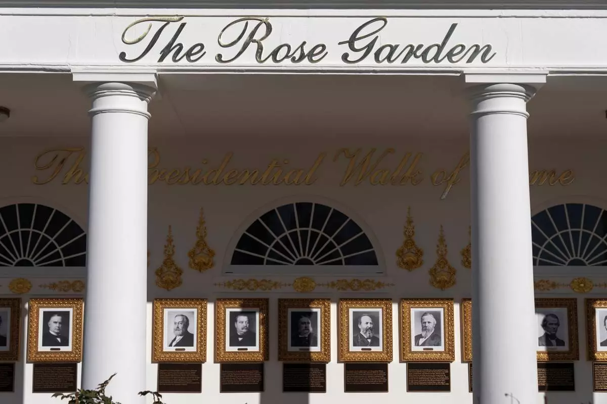 FILE - A sign for the Rose Garden is seen near the Presidential Walk of Fame on the Colonnade at the White House, Jan. 13, 2026, in Washington. (AP Photo/Mark Schiefelbein, File)