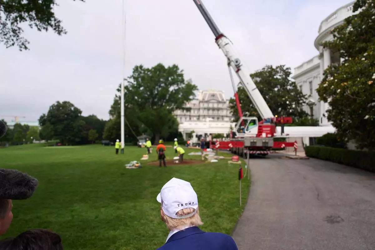 FILE - President Donald Trump speaks with reporters as a flag pole is installed on the South Lawn of the White House, June 18, 2025, in Washington. (AP Photo/Evan Vucci, File)