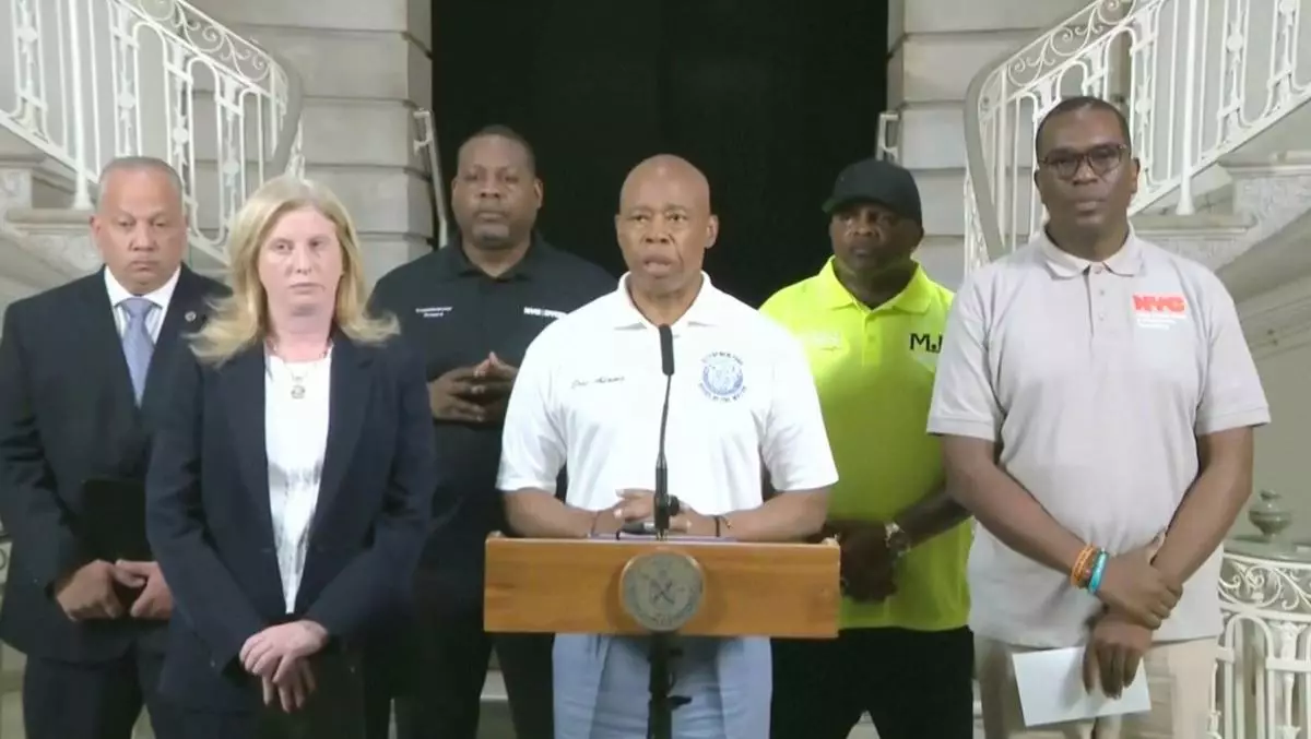 This image taken from video provided by the New York Police Department shows mayor Eric Adams speaking during a news conference in New York, Sunday, Aug. 17, 2025. (NYPD via AP)